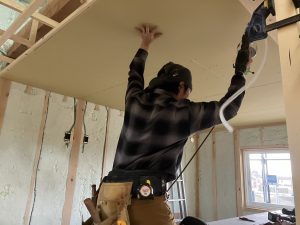 天井に貼るボードはプラスターボードという不燃材を貼っていきます。